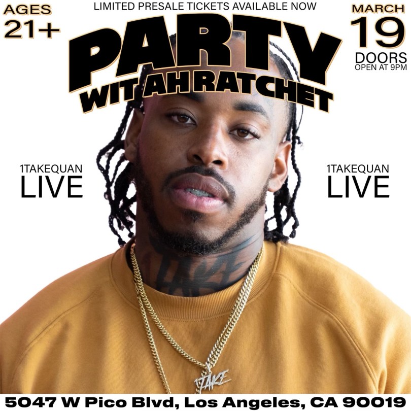 1TakeQuan will be performing on March 19th in LA! Get your tickets here: https://www.eventbrite.com/e/party-wit-ah-ratchet-1takequan-live-tickets-561002251837