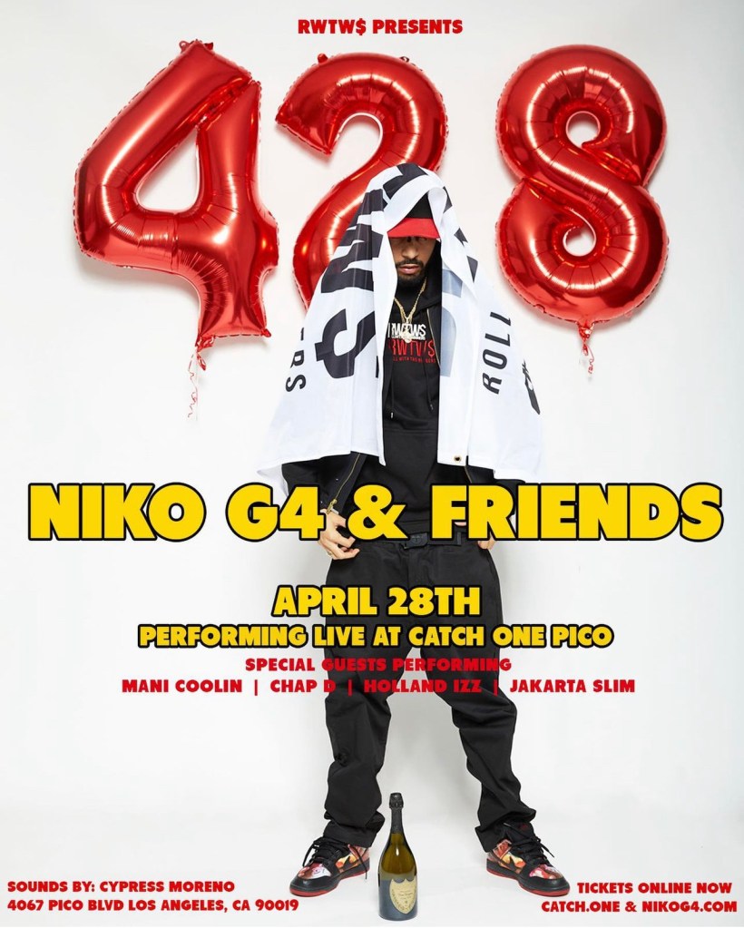 Niko G4 & Friends will be happening on April 28th at Catch One.