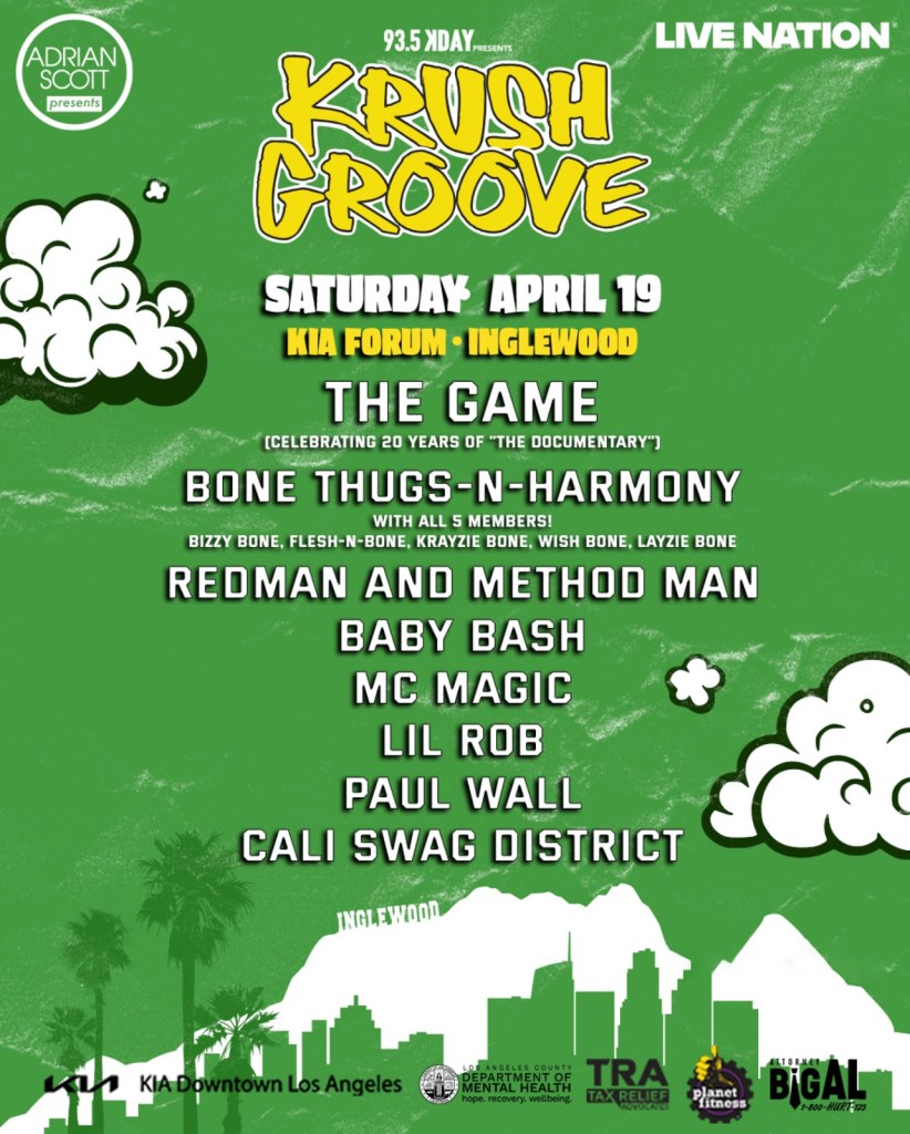 Krush Groove is hitting Inglewood with The Game, Bone Thugs-n-Harmony, & more! Get your tickets ASAP! Tickets here: https://www.ticketmaster.com/935-kday-presents-krush-groove-festival-inglewood-california-04-19-2025/event/09006177D61D3DEB