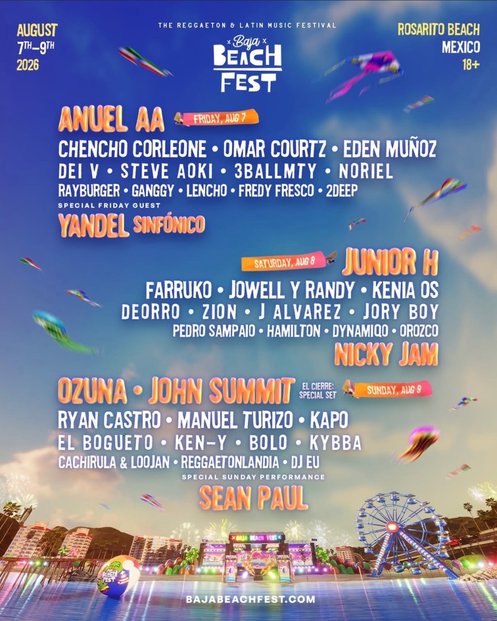 Celebrating their 8th year, Baja Beach Fest has announced their lineup for 2026. Going down August 7th – 9th in Rosarito, enjoy three days of reggeaton, EDM, Regional Mexican music and more with headliners, Anuel AA, Junior H, Ozuna, John Summit + more.