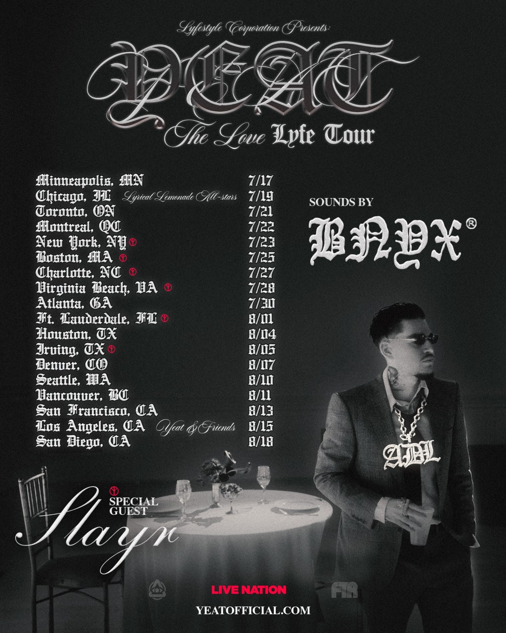 To go alongside his double album ADL (A Dangerous Lyfe / A Dangerous Love) out now on all platforms, Yeat announces his “The Love/Lyfe Tour” brought to you by Live Nation.